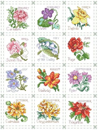 By Kooler Design Studio. A beautifully designed and detailed flower for each month of the year is depicted in this charming quilt-like sampler. These flowers can be used as a complete sampler as shown or individually on bookmarks, ornaments, small frames or on hand towels. The classic botanical style is timeless and will fit any dГ©cor.