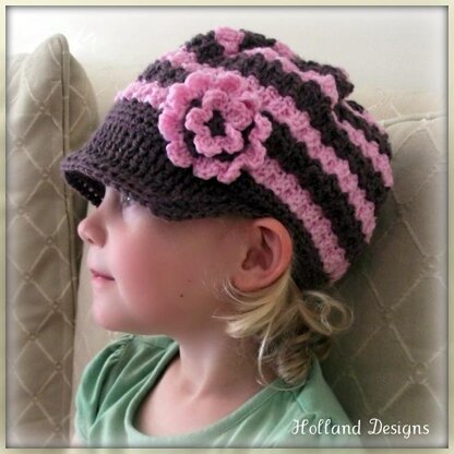 This cute little newsboy hat is crocheted using worsted weight yarn in 2 colors of choice. Design features flower petal stripes, a ribbed brim and layered accent flower.