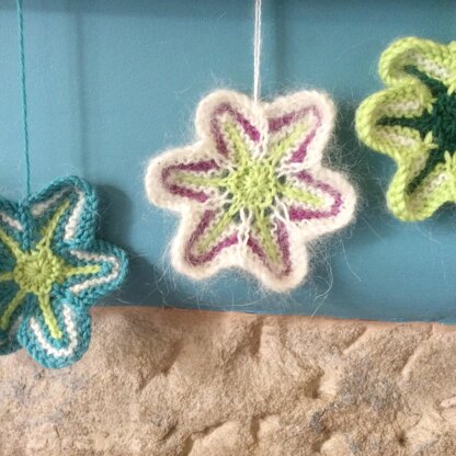 Pretty 3 coloured knitted Christmas / floral decorations worked in the round from the outside in. The star shaped design is achieved by clever stacked decreases in contrasting colours.