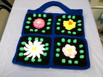 This pattern includes directions for 4 different flowers, the popcorn square which is used alone and as a background for the flowers, and instructions to assemble the bag. It would be a great project to use up some of your colorful leftover yarns. I've used black as the main color , but you could use a different color for each square for a truly unique bag that will surely turn heads!