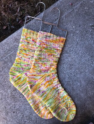 Worked from the toe up, delicate flowers speckle the top of the foot and front and back of the leg of this pretty and easy to knit sock.