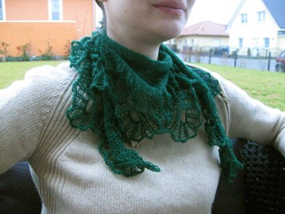 The shawl "Flowers of Traken" is a crescent shaped shawl with a large flower and fan border. It's knitted from the top-down and ends in the border.