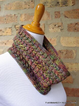 Fluid Motion is worked in-the-round beginning with a provisional cast-on. The cowl is finished with a textured i-cord bind-off on each edge.