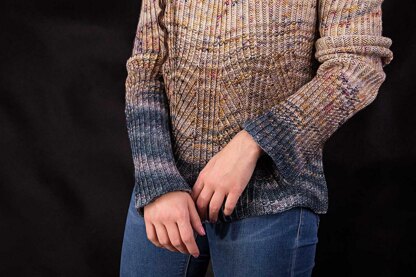 Here, you can turn the general idea and technical recommendations for blending colorways into your very own color adventure in knit. Detailed fading instructions are included on page 4 of the pattern. It is up to you to decide whether you’d like to work this garment in one color, emphasizing the texture of the pretty twisted ribbing lines, or from the minimum of three to as many colors as you like from your riotous remnant basket.