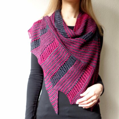This triangular shawl is worked in two colours in a mix of garter stripes and lace.