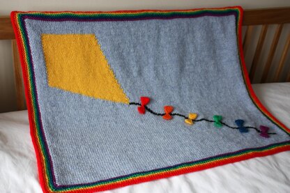 The central portion of the blanket is knitted in one piece with the kite being incorporated using the intarsia technique. The tail is stitched at the end using duplicate stitch. Clear, numbered charts are given for the kite and the tail. The border is added using garter stitch once the central portion is complete. Two options are given for the kite ribbons: for the beginners option, the ribbons are knitted in garter st; for the advanced option, the ribbons are knitted in the round. In both cases the ribbons are then stitched in place.