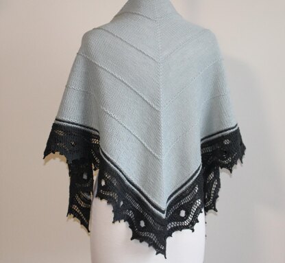 Folk knowledge says that every fog in August means a snowfall come winter. This shawl combines an eddying lace edging with a simple stockinette field of parallel lines, just as the whorls of summer’s morning fog might contrast with the crisp clean of a winter snow. The raised slip-stitch chain pattern provides texture, and the knitted-on border provides drama and contrast.
