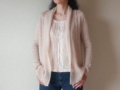 Foggy Day is an open front cardigan with an airy wide collar. The body and sleeves are worked from the top down seamlessly and shaped with raglan increases, with two strands of lace weight yarn held together. Then stitches for the collar are picked up along the front edge of the body and worked sideways in Brioche stitch with a single strand of yarn.