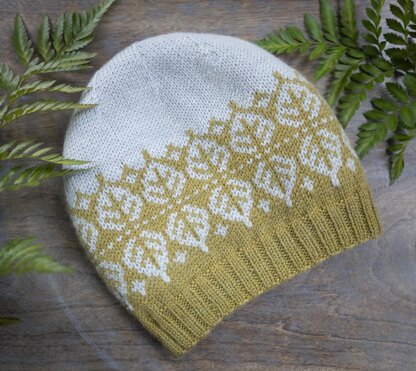 The Folia Hat features a simple stranded motif inspired by leaves reflecting off the water’s surface, still and serene. The pattern is recommended for knitters who have experience with stranded colorwork, reading from charts, and knitting in the round. The sample shown above was knit in YOTH Yarns Little Brother in the Golden Kiwi and Oyster colorways. This yarn is 80% Merino Wool, 10% Cashmere, 10% Nylon (polyamide), and each skein is 435 yards per 100 grams.