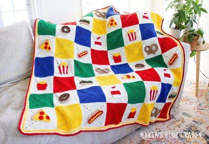 The Crochet Foodie Blanket is comprised of granny squares and 8 spring themed appliques: popcorn, pretzel, donut, pizza, cheeseburger, hot dog, soda cup, and fries. Each will be made separately then sewn onto the granny squares.
