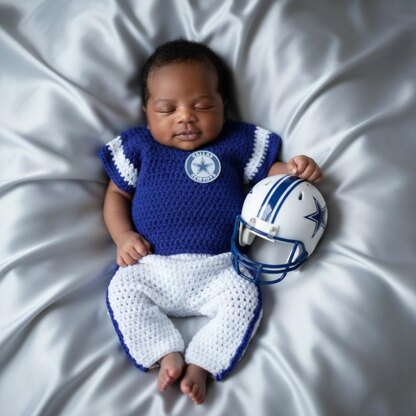 Yes just like the big guys, this sweet little Dallas Cowboys inspired outfit is super cute, fun and easy to make. Pattern is written in US terminology. Jersey is done in 1 piece and pants worked from ribbing down. Great beginner pattern. Size 3 Months