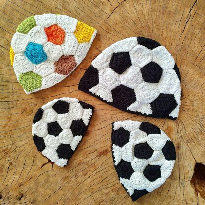 This is a crochet pattern to make Football/Soccer Hat in four sizes: baby, toddler, teenager, adult. No matter which team you support, you’ll be ready for the first whistle with this set of beanies. Make them to fit your whole family and enjoy time together! You will need just one skein of 50g sport weight yarn in black and white (or replace black motifs with scraps of multicoilor yarn, for multicolor hat!)