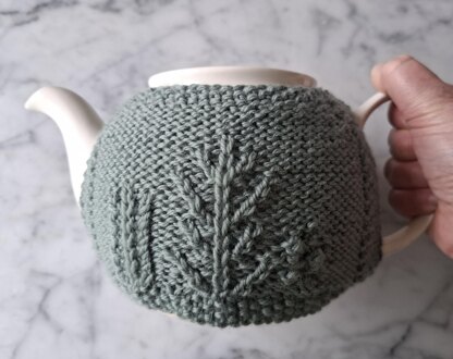 Foraois (pronounced FUR-eesh) is the Irish Gaelic word for forest. The bare branches of a deciduous tree, the plush foliage of a conifer, and the soft round shrubs growing beneath the canopy are suggested by the cable motif, creating ‘trees’ similar to that found in traditional Irish woodland. The teacosy is worked flat in two pieces, which are seamed when finished, leaving an opening for handle and spout.