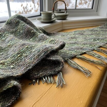 This shawl uses four different textures of yarn, held double throughout, for a unique cozy shawl. It is a simple garter knit, with eyelets for visual interest and a fun fringe that shows off the different yarn textures. It is a wearable shape that will look very different depending on the colours you choose, whether a similar palette or a varied one, and can be made smaller or larger according to your preference and yarn amounts. It is perfect for those interesting single skeins in your stash that you love but haven’t found a project for!