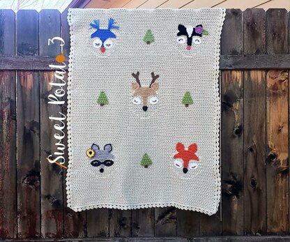 Supplies will include about 1,350 yards of the main blanket color yarn and of course use up that scrap yarn laying around for the animal faces. The faces are designed to accent the main detail in the upper face of the animals especially the eyes and ears. Add other fun applique pieces to make it fit your decor, the pattern includes a large flower, small flower, leaf and even a tree pattern you can use.