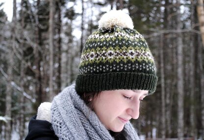 The earthy colours of the forest have inspired this hat. Greens and browns create this Fair Isle pattern with the occasional hint of cream, as if it was sunlight tricking down to the forest floor. This hat is knit in the round, fairly dense to keep its shape and then topped off with a pompom. It starts with extra wide ribbing that can be folded up for a thick double brim. Knitted in 100% wool, this hat is incredibly cozy and you will feel like you are taking a piece of the forest with you wherever you go.
