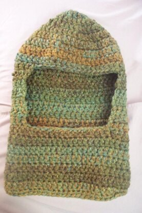 Made in one piece with bulky weight yarn double - stranded for a thicker cover for head, neck and top of shoulders. It can be worn under a coat as an extra layer of warmth from the howling wind.