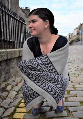This modern rectangular wrap has beautiful forest-inspired fair isle detail and a lovely moss (seed) stitch border around the entire wrap.