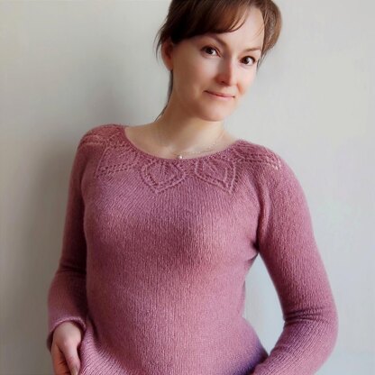 Construction: The sweater is worked in the round top down on circular needles, with German short rows for back neck rise and with waist shaping at the sides of the garment. Both charts and written instructions are provided for the lace stitch pattern.