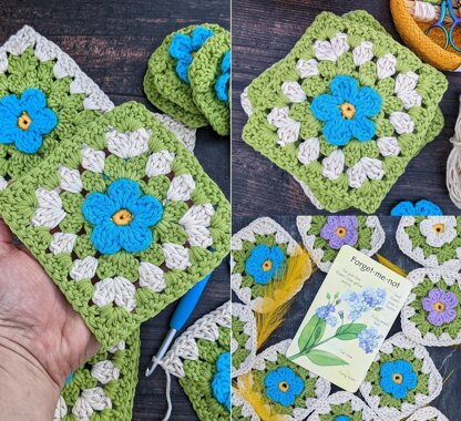 This a flowery twist on the classic granny square featuring my favourite ever flower the Forget-me-not. This quick and simple 3D square is best made with a cotton yarn and will look it’s best after some wet blocking. Made in 6 rounds features a 3D Forget-me-not flower centre surrounded by classic granny square stitches. Perfect for beginners that are familiar with slip stitch, chain, back and front loop, double crochet and treble crochet. That’s it really! Only 5 terms and 2 stitches.
