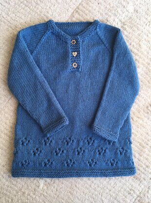 The Forget-me-not tunic uses a lacy five-petalled flower inspired by a stitch pattern at gannetdesigns. It’s a quick knit seamless design, worked from the top down, that’s great over leggings or tights and shorts. The only sewing you need to do is to add the buttons. The result is a no fuss garment in an easy care, acrylic yarn – designed with kids and carers in mind! Please note that you will need to be comfortable working a variety of increase and decrease methods to create the flowers: k2tog, ssk, skp, kfb, lifted increases (m1l and m1r).