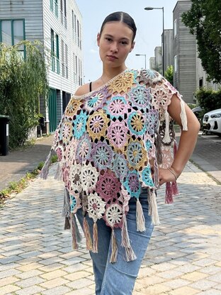 Measurements: Poncho: width about 80cm/31.5” and length about 65cm/25.5” 1 motif measures about 14cm/5.5” across.