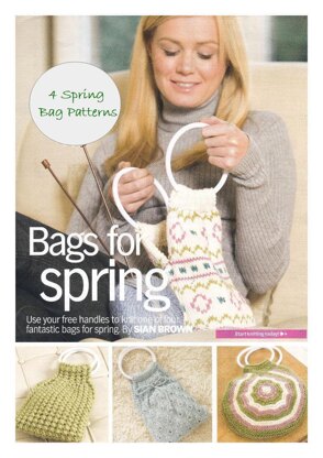 This is a pattern for Four Bags for Spring, originally published in Knit Today. The patterns are: Bud Stitch Bag in Debbie Bliss Alpaca Silk Aran (now discontinued. Tension 18/24), Chunky Circular Bag in Rowan Cocoon, Chunky Rice Stitch Bag in Rowan Big Wool, and Fairisle Pattern Bag in Sublime Cashmerino Silk Aran (now discontinued: tension 18/24). They all fit on circular handles approx. size 15 cm. You will need for the Rice Stitch bag: 2 x 100 gm balls yarn, for the Chunky Circular Bag: 1 x 100 gm ball each colour, for the Fairisle Pattern Bag, 2 x balls main, 1 x ball each contrast yarns. For the Bud Stitch bag, 2 x balls yarn. Photos Knit Today.