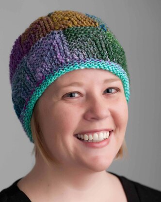 This hat is made with two rows of mitered squares. It is made to be knit until it is the size desired. There is one very small seam, but otherwise, no sewing!