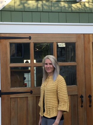 A slightly cropped, oversized raglan jacket with a three-button closure at the neck and bell sleeves. Worked top down in one piece to underarm. Sleeve sts are placed on hold and the body is worked downward. A great pattern for the beginning top down sweater knitter; this pattern includes simple raglan shaping and easy techniques. It is worked at a large gauge on big needles making for a quick knit. Can you do it in four days?!