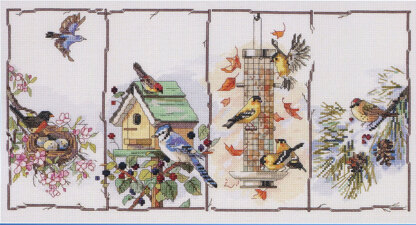 Designed by: Nancy Rossi. A flurry of feathered friends. A bird for each season captured in this Four Season Birds Counted Cross Stitch.