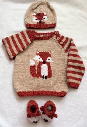 I designed this set purely by chance, I happen t have this fox (or at least a desgn very similar) as my phone case... I thought how cute it would look as a knitted jumper, then of course the beanie style hat was next, followed of course by the booties.
