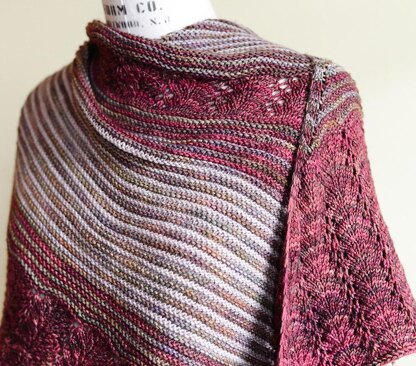 This 3-color, asymmetrical triangular shawl is an addictive knitting adventure! Fox Tails Shawl has stripes of garter stitch, a simple color layout and a surprisingly easy lace pattern resembling fox tails. You’ll want to knit just one more row, and just one more row again!