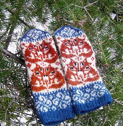 Simple fox mittens with an afterthought thumb. The mittens are 60-sts wide, and can be knitted with fingering or sport-weight yarn. The suggested gauge is approximate for size small (18 cm hand circumference); adjust your gauge if you need a different size. A few black stitches are embroidered with duplicate stitch.