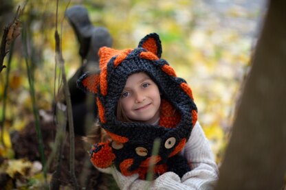 this is a flat knitted scarf, which is after folding became a hooded scarf/cowl - very festive if made in fox colors, but could be mad ein one color without ears too. When no hood needed, simply drop it off the head and it will be cowl warmer.