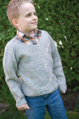 This chunky-weight raglan has a random geometrical pattern on the front that’s been set into a stocking stitch ground. I designed the pattern “free hand” following a simple rule of no more than 4 purl squares (4 sts x 5 rows each) for each horizontal or vertical line. The chart has been scaled up and down to be proportional in all the sizes. However, in the spirit of random play, feel free to work up your own variation of stacked checks on your sweater.