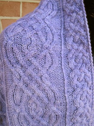 This shawl is knitted with sport weight. The shawl is approximately 22 1/2 inches x 74 inches. Both the The focal cable stitch and the side cable stitch comes to us from Canada and the creative mind of Annie Maloney.