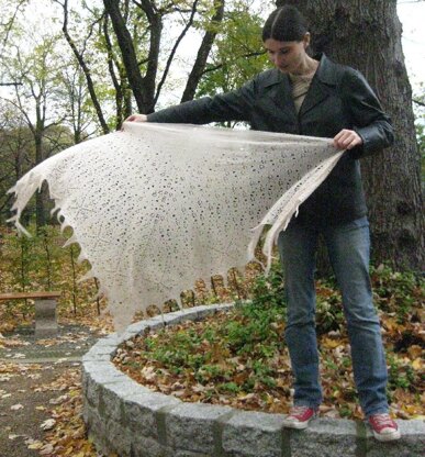 A shawl to symbolize snow fall. It starters in clear weather and then the snow starts to fall until you can see the snowflakes and the first icicles begin to form. The shawl is inspired by the germanic fairy tail "Frau Holle" who with her household chores is responsible for the weather and when shaking the bed the feathers fly and become snow on earth. The other inspiration is my friend Juliane who is addicted to lace knitting.