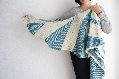 Le jeu des rangs raccourcis, mis en valeur par le contraste des couleurs, apporte toute sa particuliarité à ce grand shawl enveloppant. Un modèle tout au point mousse, avec des lignes simples mais originales.
