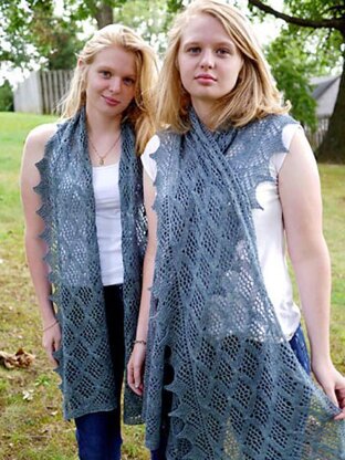 This airy scarf or stole is light enough to float away on a breeze, yet provides the perfect amount of coverage for a crisp fall morning. The cable twists placed at each corner of the openwork diamonds give the fabric just the right amount of weight to form beautifully draped folds along its bias lines. The design features asymmetrical edgings for an interesting twist. The fabric is complex to the eye, but in fact is a cinch to work—the motif is made up entirely of eyelets and simple decreases with a few cable crossings; wrong side rows are worked mostly in purl.