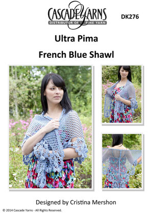 French Blue Shawl in Cascade Ultra Pima - DK276 is a free Advanced Beginner Crochet pattern by Cascade Yarns, available as a Downloadable PDF and includes instructions in English. Super fun to make, this pattern could be your next masterpiece!