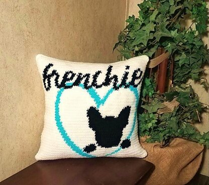 Pattern includes instruction and tips for how to do intarsia crochet, specific instructions for THIS particular pattern and a colored graph. “I Love This Yarn” brand yarn was used for this pattern, however any medium weight (#4) worsted weight yarn with comparable colors can be used. Front of the pillow has the french bulldog art, the back is plain white.