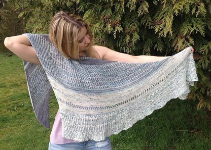 This is sideways triangular shaped shawl started with a few stitches and growing gradually alternating simple stripy garter section with little bit of eyelets and soft, squishy brioche section. The delicate colors of the yarn remind the cool, fresh waters of the beautiful mountain rivers of British Columbia.
