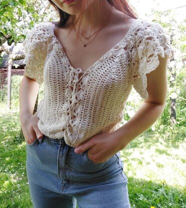 This top is the perfect summer top you may need. The fit is cropped and looser. You can make it as flowy top with sleeves or a simple tank top. It pairs with everything. The best yarn for this top is some kind of cotton/ viscose/ bamboo yarn that will have a nice drape.