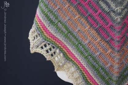Friday Street is a triangular shawl with stripes, slipped stitch texture and lace edging, this shawl pattern offers a choice of 2-colour, 3-colour or 5-colour options.