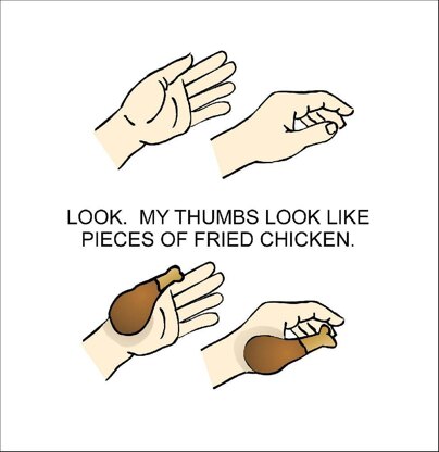 Let's hear it for thumbs! Thumbs are meaty and important equipment. One thumb is the counterpart to four fingers: It can work with one finger to snap, or with all four fingers to hang on for dear life. It can swing around in a big circle and flex forward and back at the top joint. The Fried Chicken Mitten hugs the thumb's curves and moves without stressing the rest of the mitten.