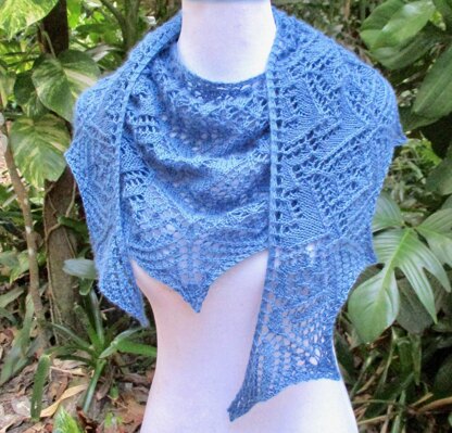 The 2 ply laceweight shawlette sample in dark blue used 3.5 mm needles and took 410m of yarn (one ball of Knitpicks Shadow lace). The 4 ply fingering shawlette in mid blue used 4 mm needles and took 350m of Cascade heritage sock yarn (less than one 100gm ball).