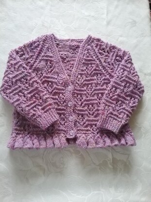 Girl's v neck cardigan with frilled edge and lace flower pattern, age 3-4 years, 24-26" chest. Knitted in Sirdar snuggly doodle but other dk yarn can be used.