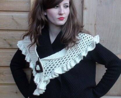 This holey ruffle-edged wrap is one of our spring-time designs. We often need a little something light but warm to wrap around our shoulders when out-and-about, either in the Devon countryside or dashing into town for a quick peruse around the shops, beach walks, or parties. The Frilly ‘O’ Wrap has a moss stitch border at the widest part and an optional ruffle all along the bottom for extra flamboyance.