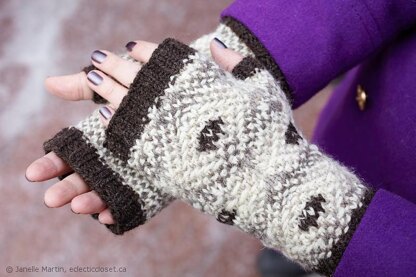 If you wish to make the full set, you will need a second skein of the MC yarn and CC1 yarn. After finishing the Frost Boils Cowl and Frost Boils Boot Cuffs, there was still enough of CC2, CC3 & CC4 yarns left for these fingerless mitts.