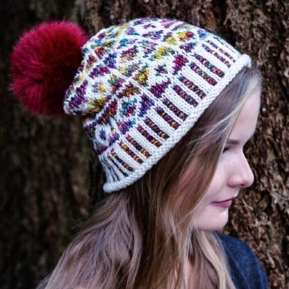 This eye-catching stranded knitting set pairs a solid and variegated yarn together, in a diamond, windowpane design, to create the look of stained glass. Worked in the round the pieces feature corrugated ribbing and the hat is topped off with a faux fur pompom.